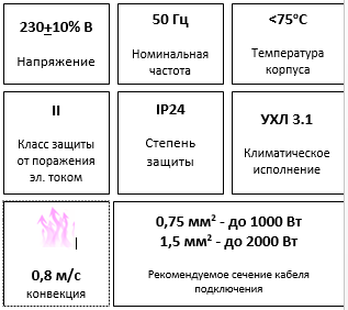 Нагревательный элемент: Нихромовая нить в миканитовой изоляции, заключенная в алюминиевый радиатор с температурой нагрева поверхности не более 120°С.