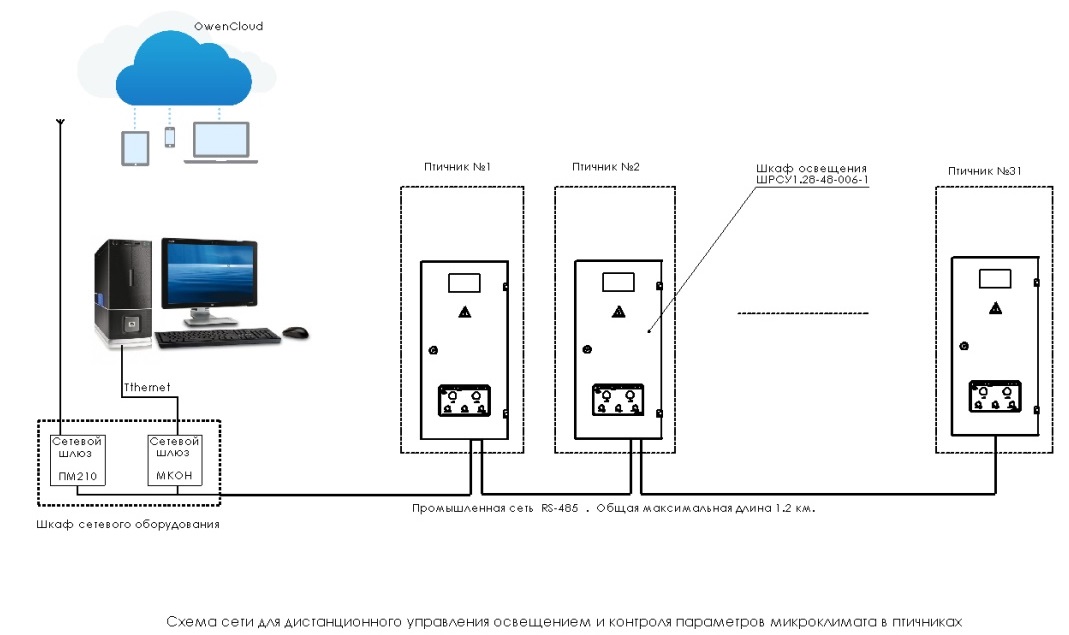 Программа управления освещением SCADA для диспетчера разрабатывается по техническому заданию заказчика, исходя из конкретных требований; количества контролируемых птичников, количества и типа контролируемых параметров, количества рабочих станций, вывода видеонаблюдения с IP камер и других задач.