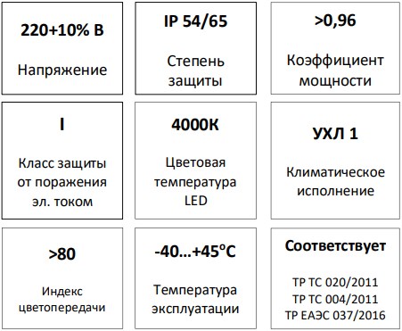 Источник света: светодиоды последнего поколения. Базовая цветовая температура 4000К, Ra≥80, ресурс модуля 100 000ч (критерий L70), падение светового потока до 10% - более 50 000ч (критерий L90)